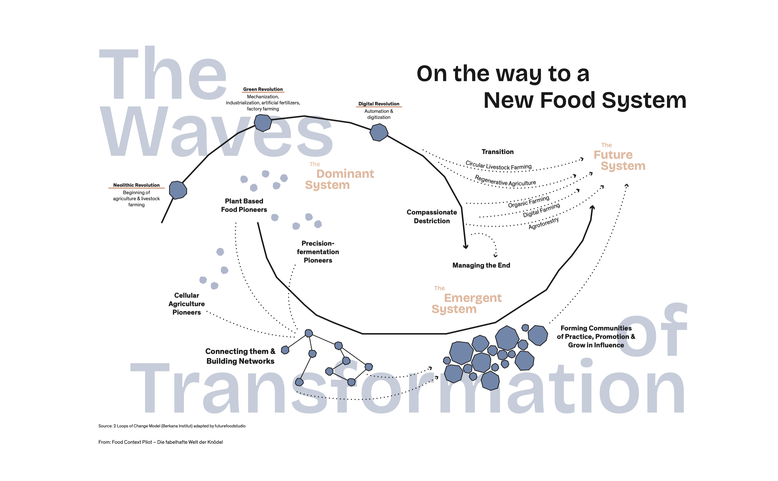 Das vom amerikanischen Berkana-Institut entwickelte „2 Loops of Change“-Modell hilft zu verstehen, wie ein bestehendes, lange Zeit funktionierendes und erfolgreiches System, das – wie unser auf traditioneller Landwirtschaft basierendes Ernährungssystem – sein maximales Entwicklungsstadium erreicht hat, in neue Stadien übergeht. Am Höhepunkt angekommen (Peak Agricultural Land, Peak Yield) gerät es in die Krise (Bodendegeneration, Entwaldung, steigende Ertragsausfälle durch Klimakapriolen, steigende Versicherungskosten, Ressourcenverbrauch) und wird durch ein neues System abgelöst beziehungsweise nachhaltig verändert.